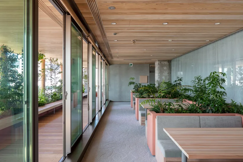 除了強調環保與回收效益,內部設施也被精心改造過。透過改良大扇窗戶與屋簷設計,可以引入更多自然光線並增強通風效果,改造後的大樓充滿木頭芬芳,佈滿綠色植物的角落更是令人心曠神怡,這棟都市綠洲般的建築更是因此獲得了國際WELL健康建築標準認證。