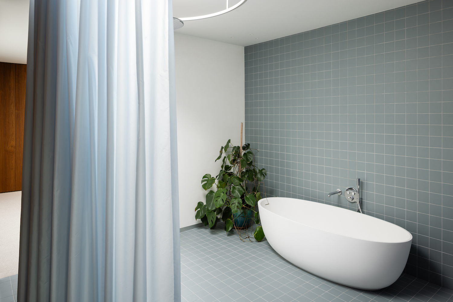 在材料選擇上,建築團隊使用低污染與永續的天然建材。綠色調的拋光混凝土地板與裸露的混凝土牆面,搭配原木家具和淡藍色陶瓷磚,構成一個簡約而不失溫潤的空間。這樣的材質不僅符合 Fitwel的材料安全標準,亦大幅降低有害物質的釋放,為居住者營造出一個健康和純淨的室內環境。尤其在主臥浴室中,圓形軌道淋浴間與天窗設計相輔相成,使之成為一處療癒心靈的私密角落。