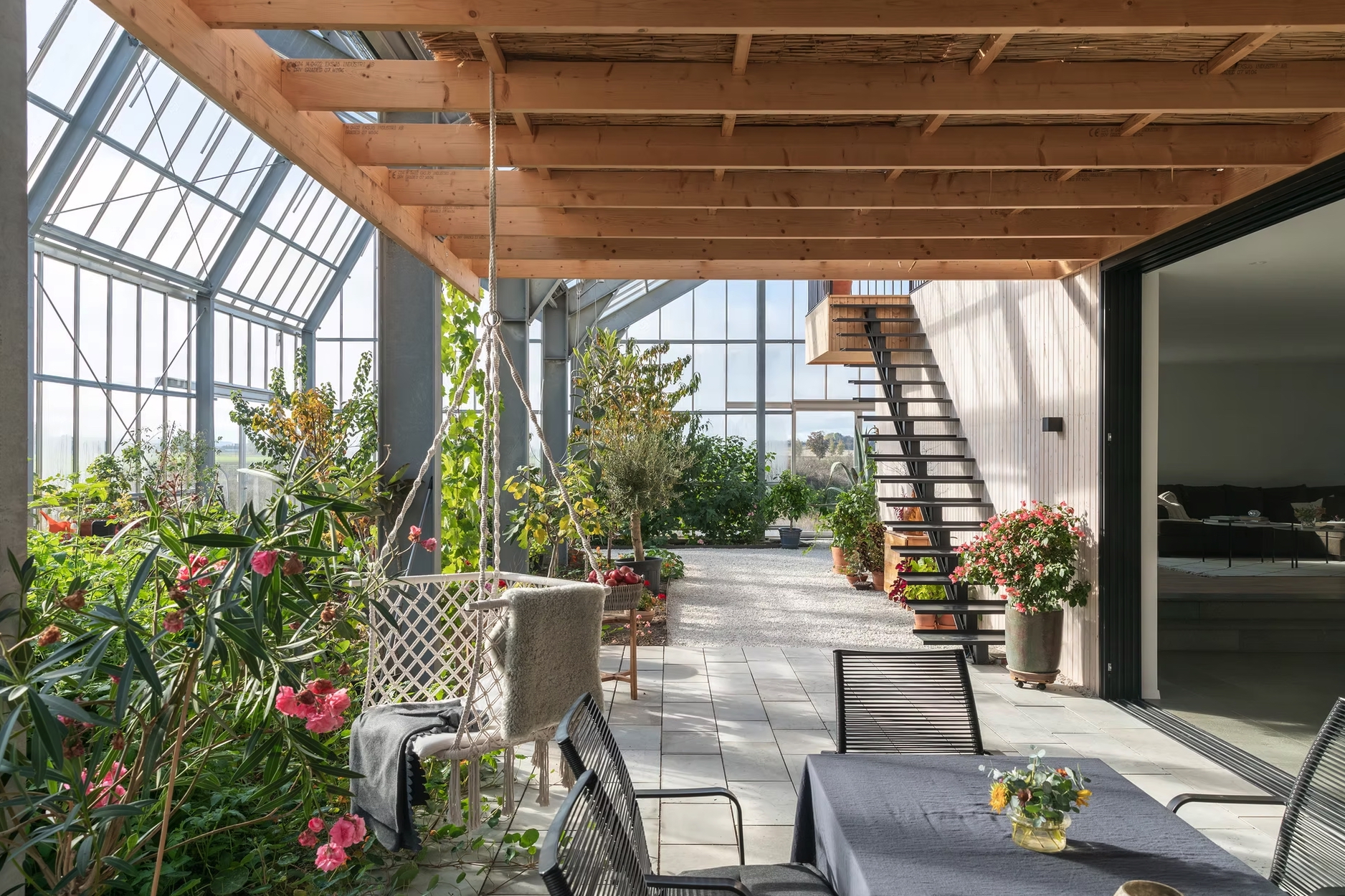 即使面對嚴寒冬季,依然可以採收葡萄、番茄與無花果,讓建築順應四季、融合自然能量,成為能調節、能共感的有機場域,讓光線、空氣、水與植物在日常中流轉,營造自然流動的生活氛圍。