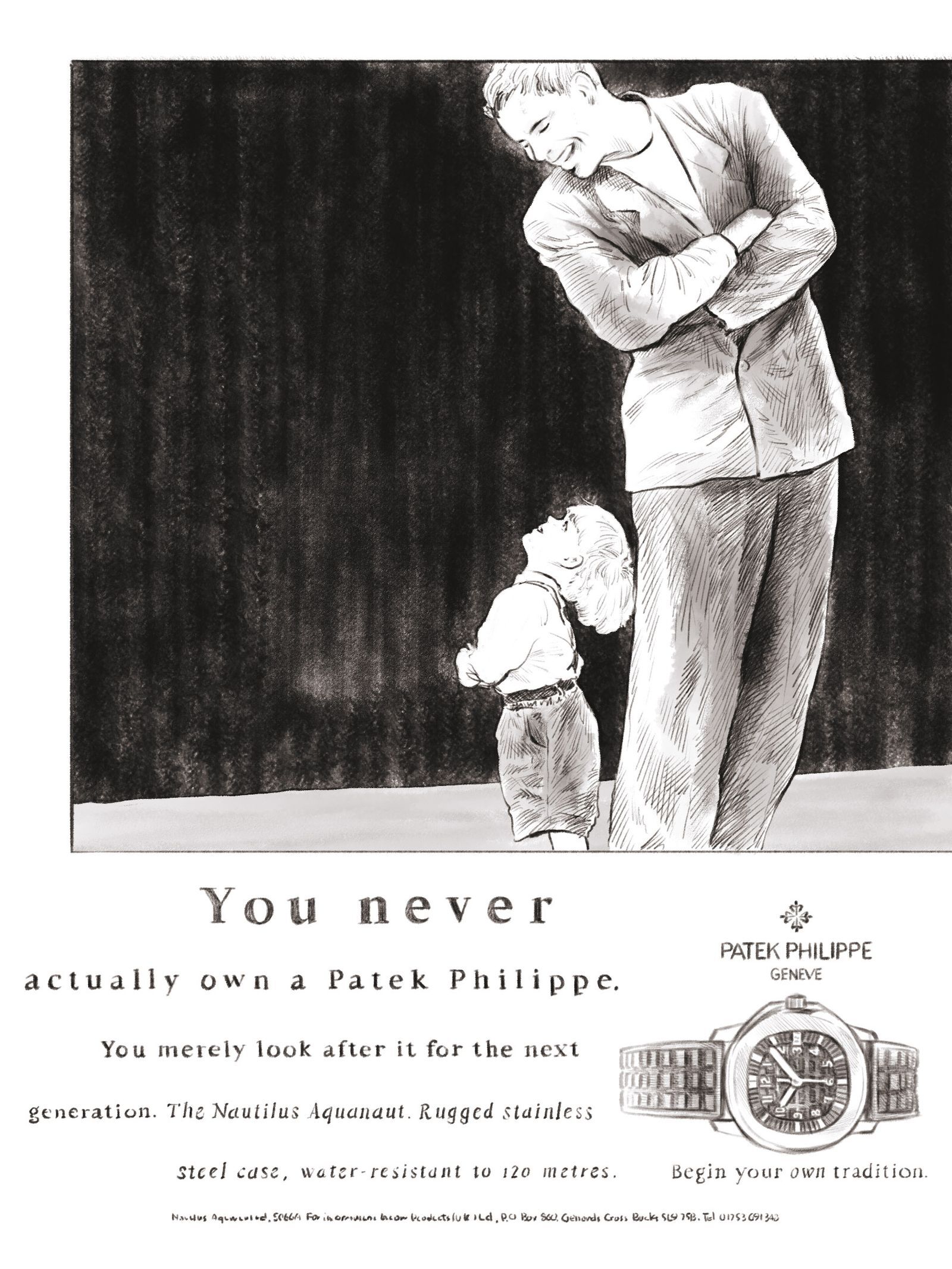 「傳家」成了品牌的中心思想,品牌於 1996 年推出其一系列經典的廣告文案,影像顛覆以明星或代言人為廣告主角的傳統策略,而是以家人間純粹、真實的情感連結,傳達出代代相傳的價值,其廣告文案「You never actually own a Patek Philippe. You merely look after it for the next generation.」一語打到 Old Money 的心坎裡,讓百達翡麗穩占難以動搖的高度。