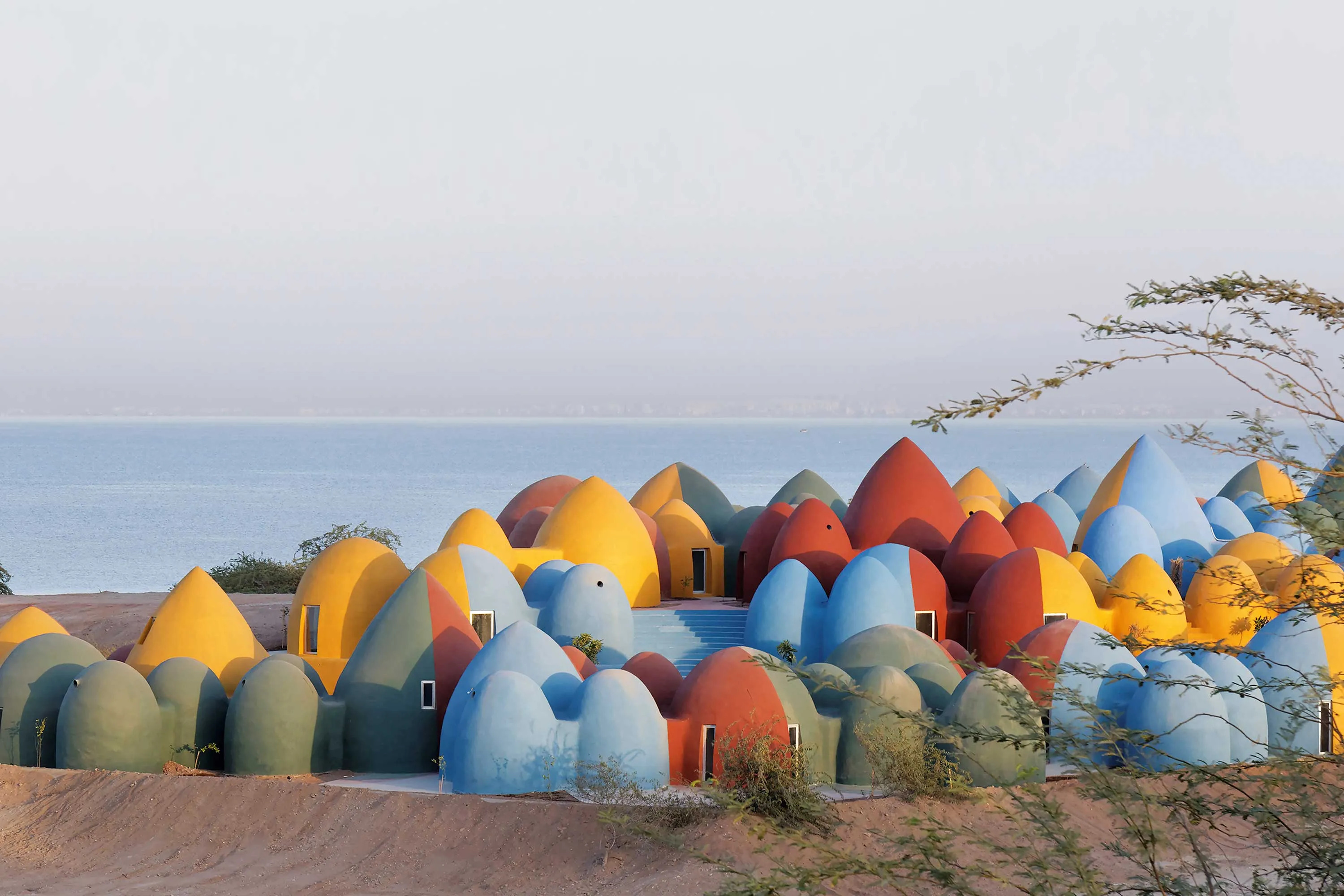 Majara 在波斯語中意為「冒險」,也確實如此:整座建築群由約200個形狀各異、大小不一的圓頂組成,外觀色彩濃烈,卻與當地紅岩、礦砂與藍海意外和諧。設計師借鏡荷姆茲島本身的色彩礦物地形,將這些自然元素融入建築表面,使其看來如同從大地生長而出。