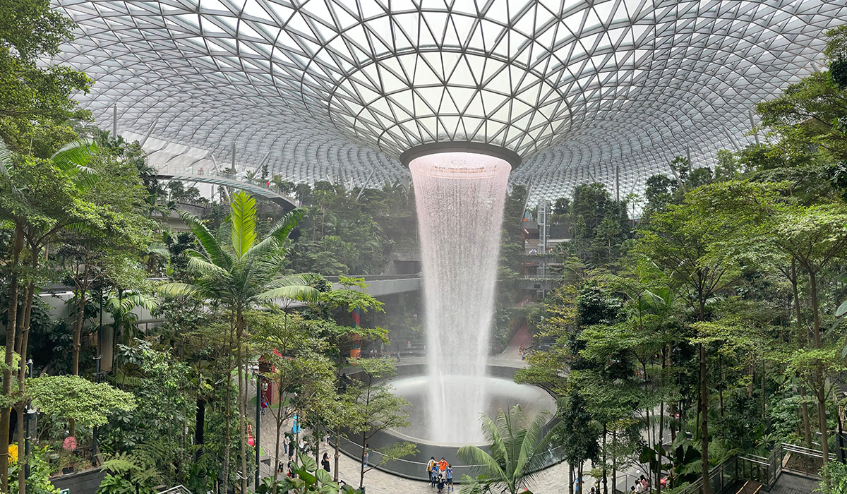 其中峽谷瀑布的「雨漩渦」位於樟宜機場正中央,是座高達 40 公尺室內瀑布,從7層樓高的玻璃穹頂傾瀉而下,灑落下的水蓄積起來,再利用於園林綠化灌溉,觀賞之餘,灌溉植栽更間接提升了機場的空氣品質。
