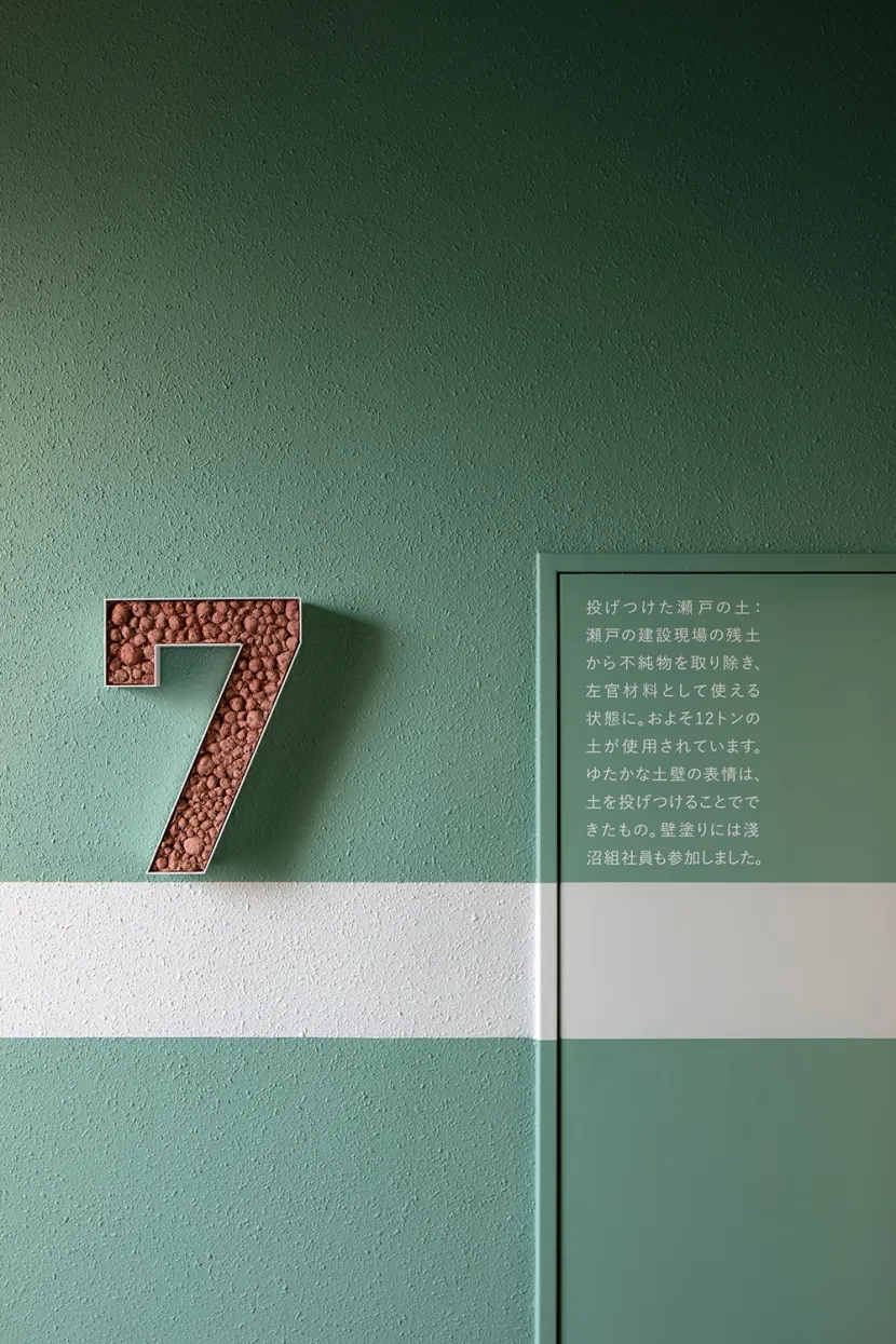 此外,工程團隊也大量使用愛知縣其他建築工地的剩餘殘土,透過專業技術進行加工後再次利用,賦予原本應被丟棄的泥土新生命。室內裝潢的表面塗料為原有建築物遺留的石塊加工製成,窗簾原料也是回收塑膠碎粒合成的聚酯纖維,並使用專業技術讓原料到成品不需任何縫製過程,將可能產生的廢棄物最小化。