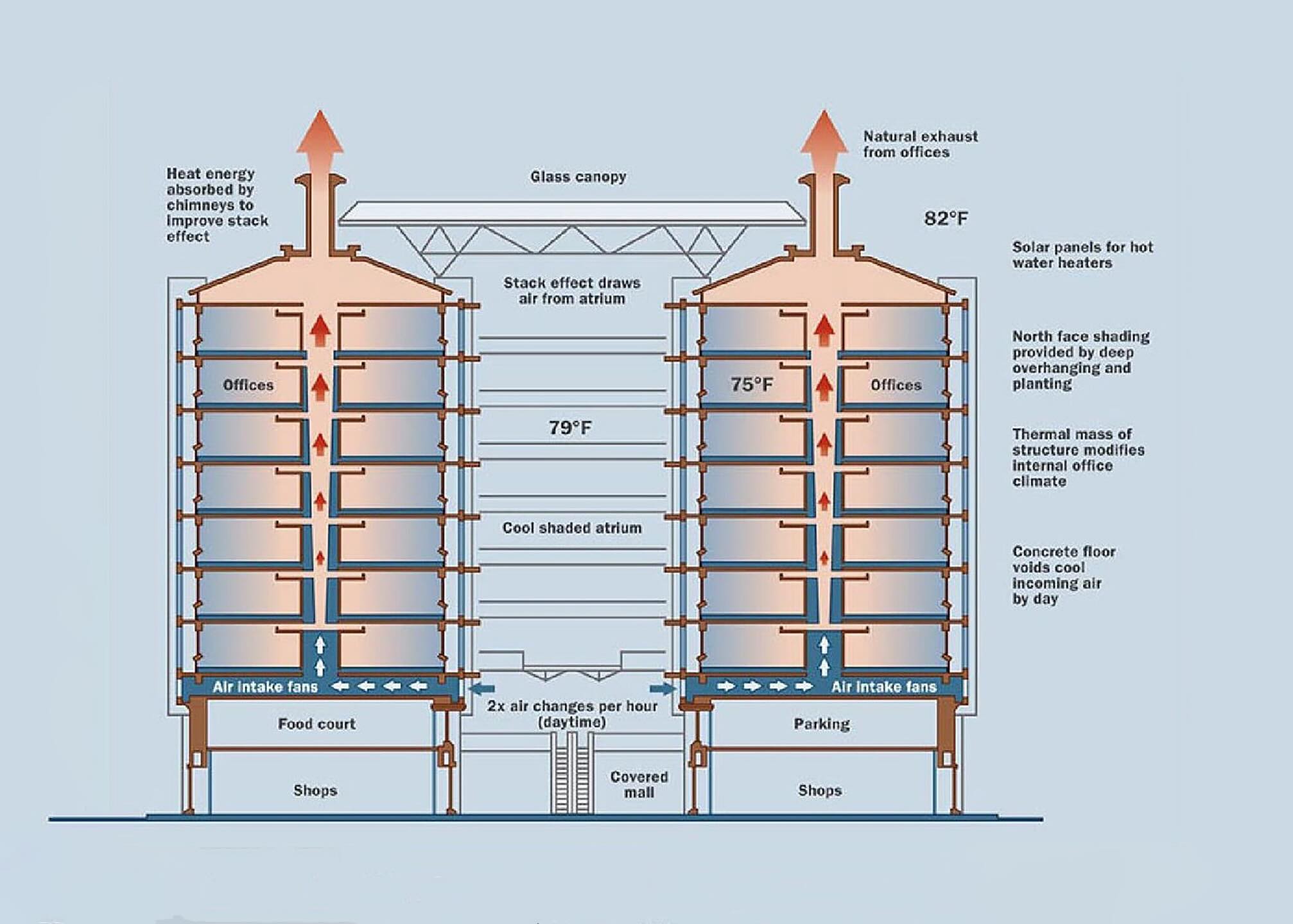 辛巴威的東門中心(Eastgate Centre),正是一座實踐這種理念的建築。它的建築師 Mick Pearce 受到白蟻巢啟發,設計出一棟不需空調,卻能全年維持舒適溫度的商業大樓。這座建築利用自然通風、熱對流與溫差原理,達到排熱與降溫的效果,每年節省近九成冷房能源。